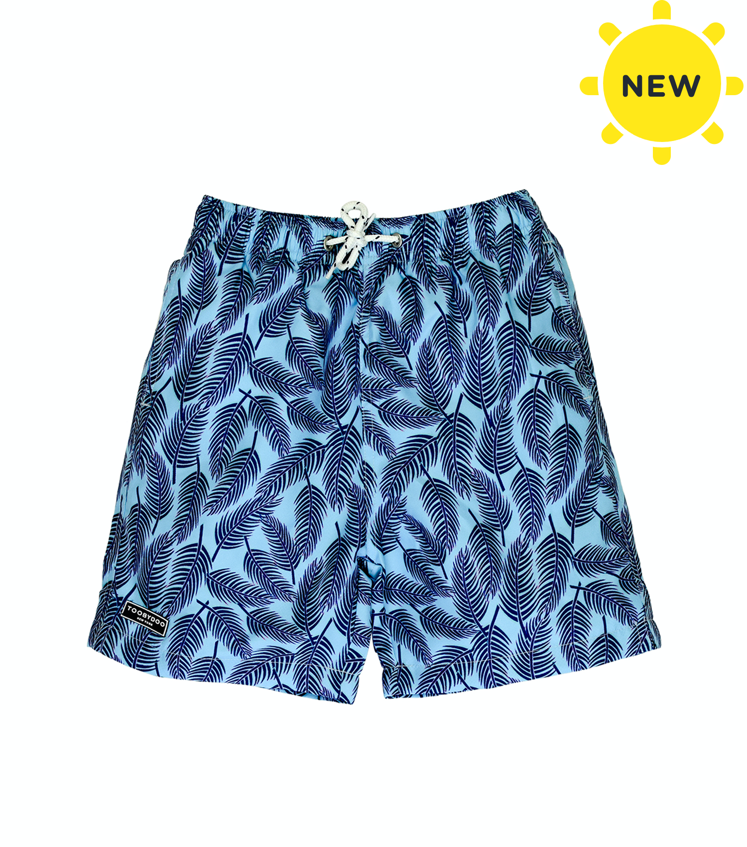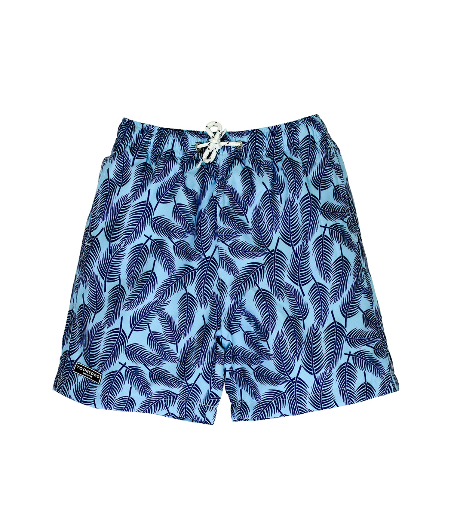 Luxury board shorts with a palm leaf on aqua blue pattern. Features an elastic waist band, sailor style drawstring, side pockets, full mesh lining, back pockets with velcro closure, special eyelets for rapid air evacuation. Shorts have a cotton feel and are quick drying (100% polyamide). Style # S20156