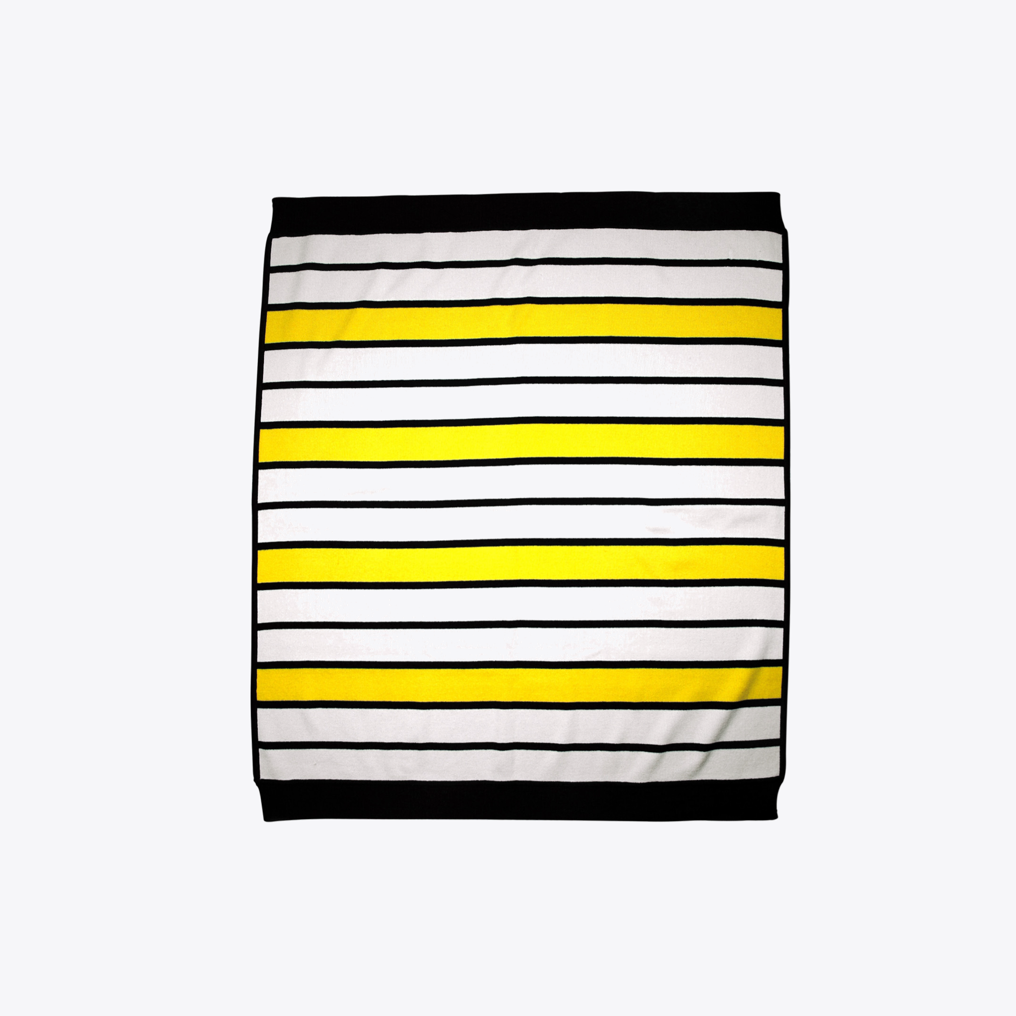 Finest luxury baby blanket, in a multi-color navy blue, yellow and natural white yarn-dye stripe. Created with the greatest care from the softest refined cotton-cashmere. The blanket measures 30"(W)x35"(H). Also get the matching jumpsuit or dress. Does not itch, machine washable. Style # B70027