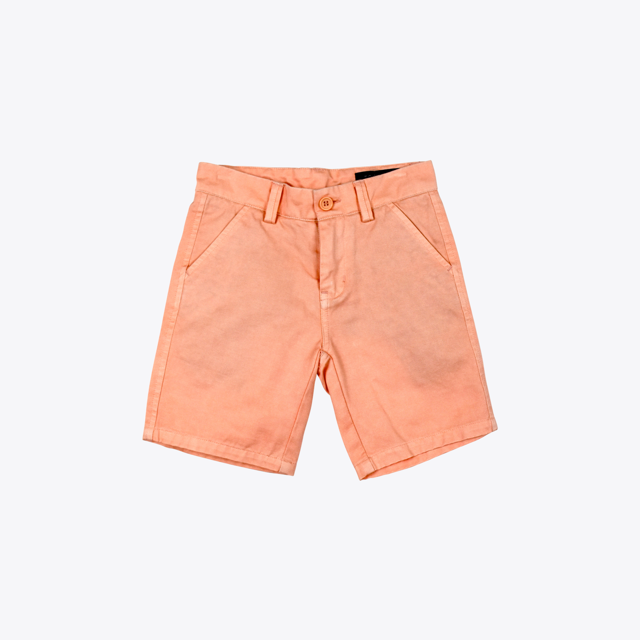 Relaxed, light and soft yarn-dye woven solid orange cotton shorts with an adjustable waist band. Button closure, front and back pockets. Machine Washable. Style # J40082
