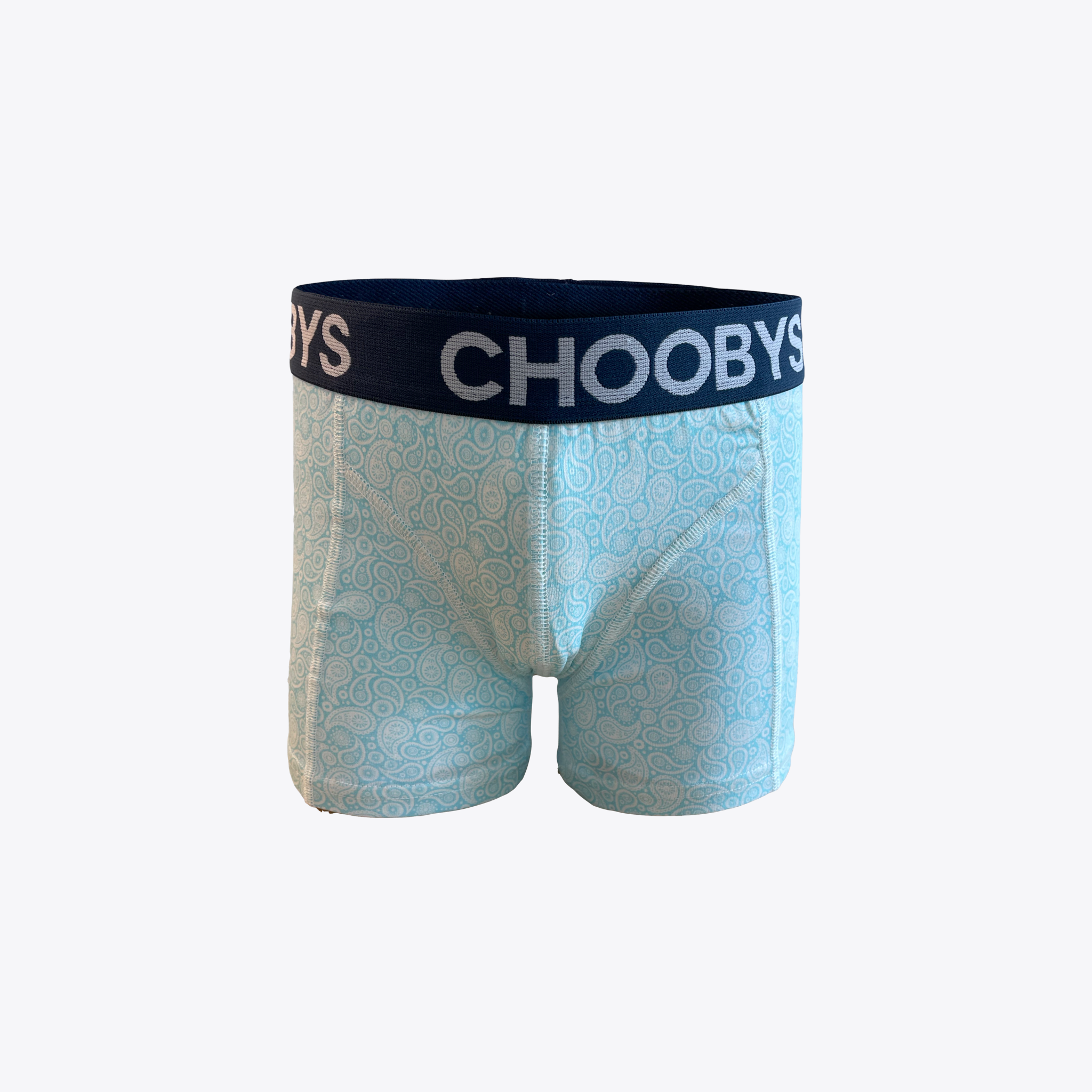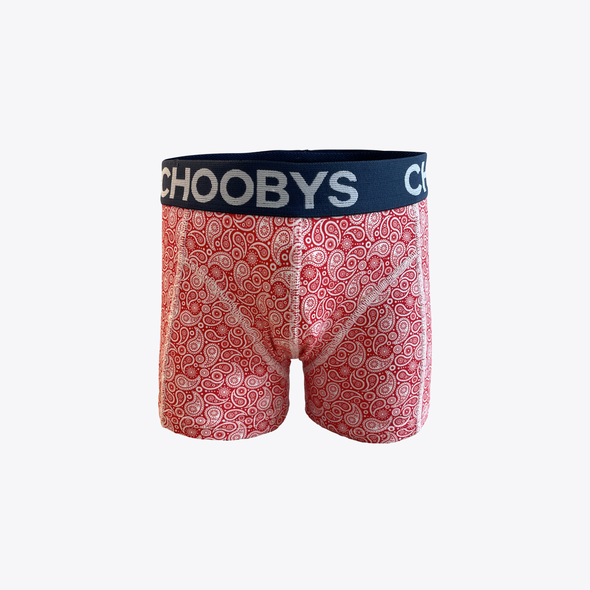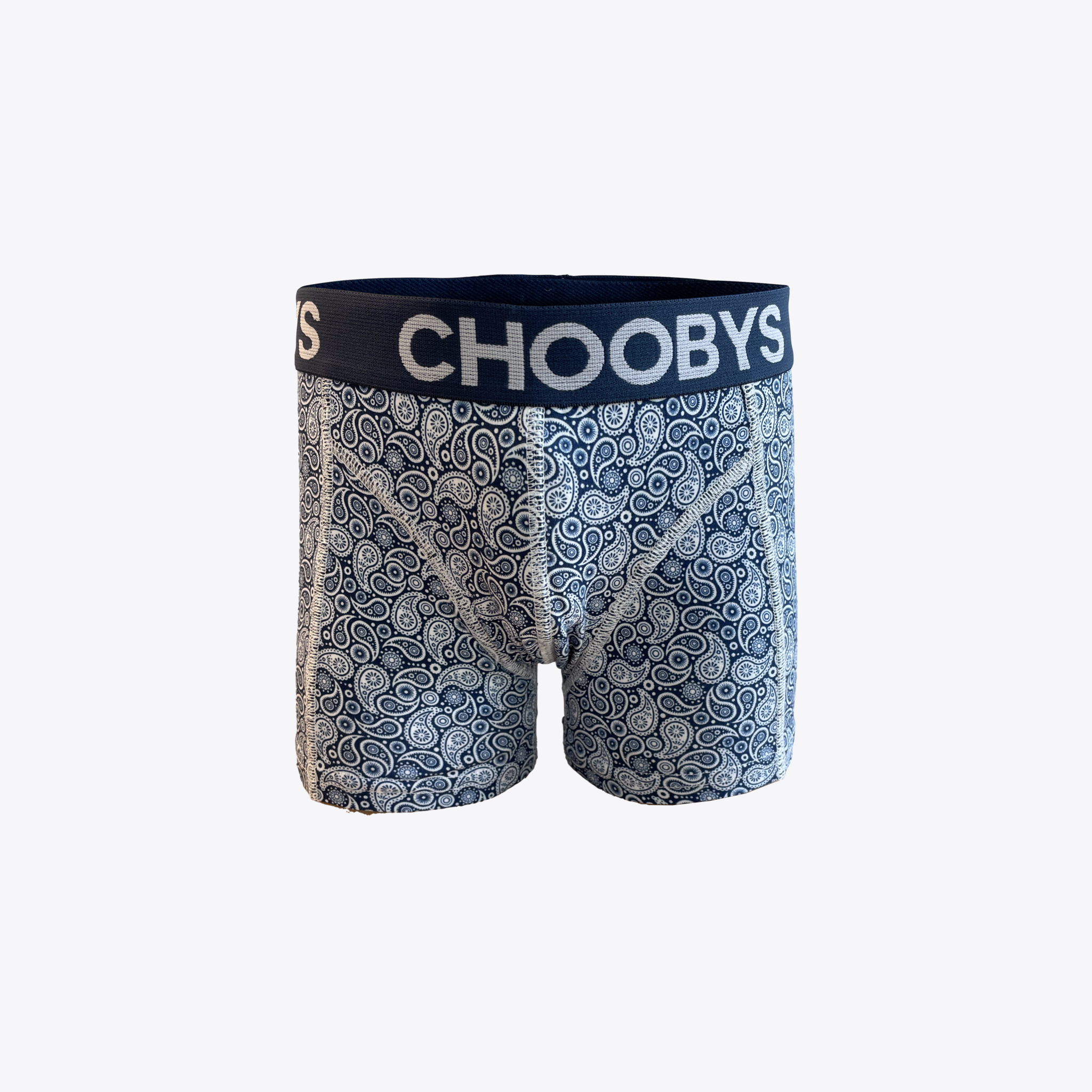 Toobydoo x CHOOBYS collaboration. Super stylish boxer brief 3-pack with Paisley patterns. Created in an ultra-soft stretch cotton. Soft lined elastic waist band. CHOOBYS run slightly smaller than Toobydoo. Order one size up when in doubt. Machine wash cold, tumble dry low. Style # CB-3P-05