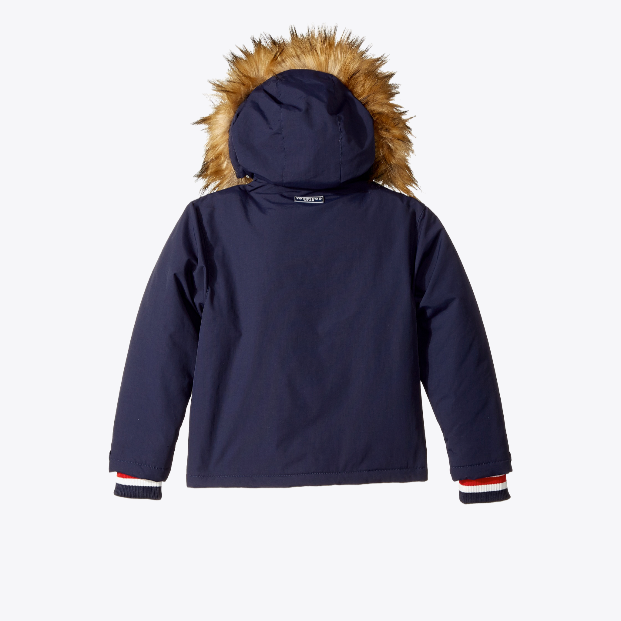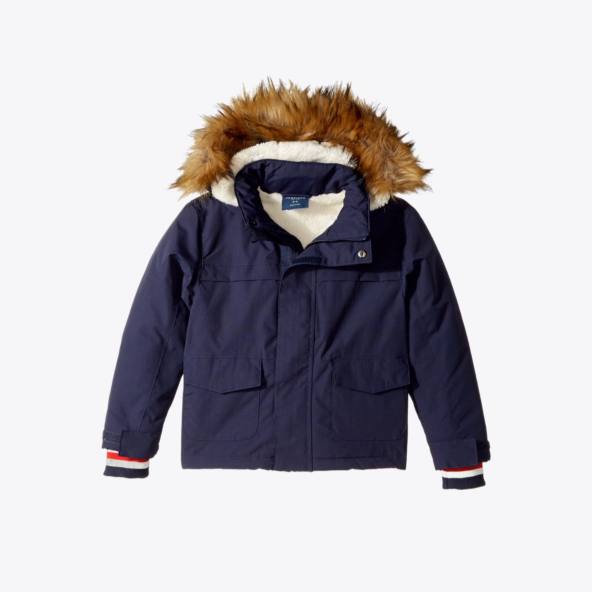 Warm up in the super cool fleece lined Parker parka that will keep you warm. Attached hood with soft faux fur trim. Stand collar with snap closure. Long sleeves with contrast ribbed cuffs. Hand pockets with foldover flaps.Machine wash cold. Style # J90030
