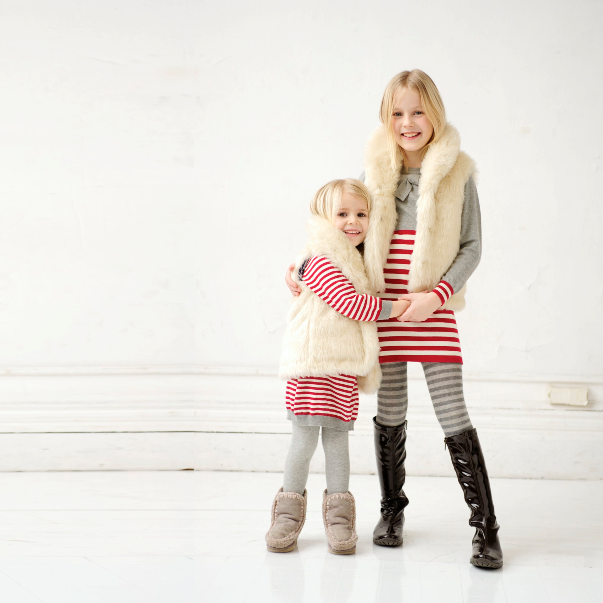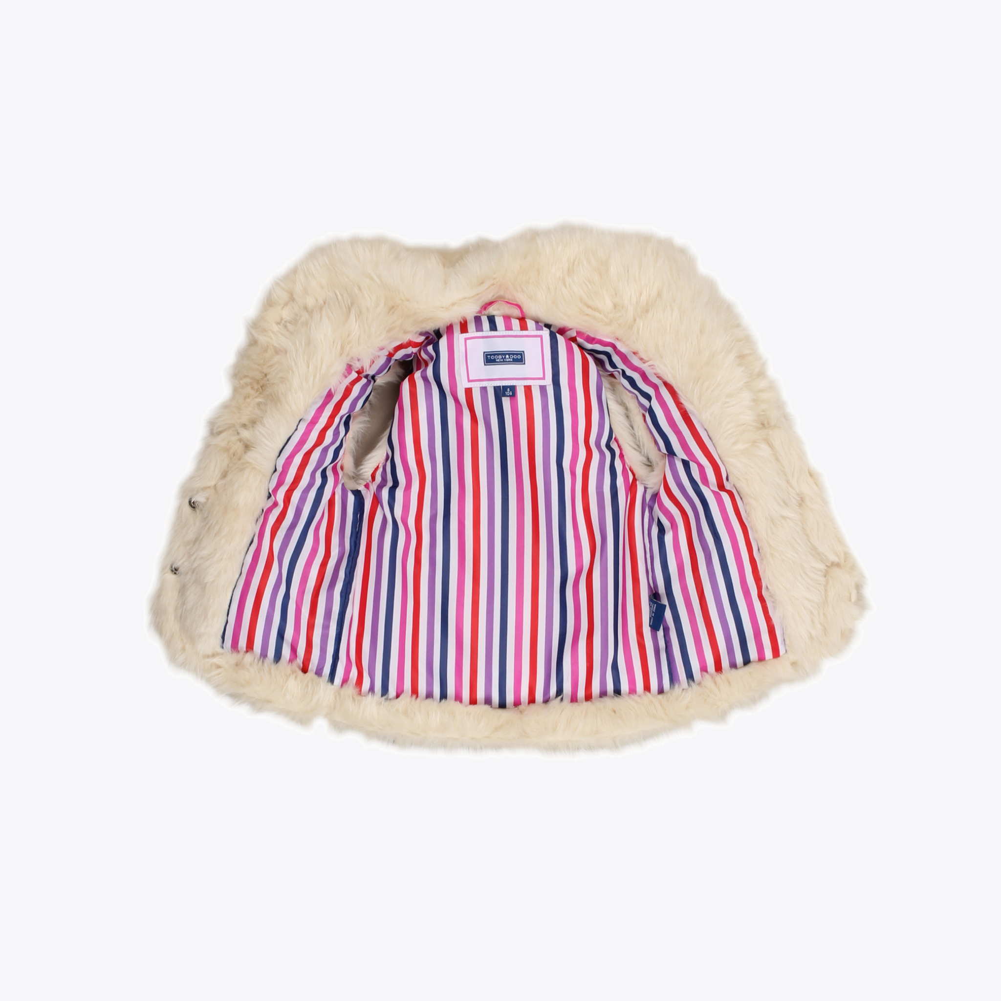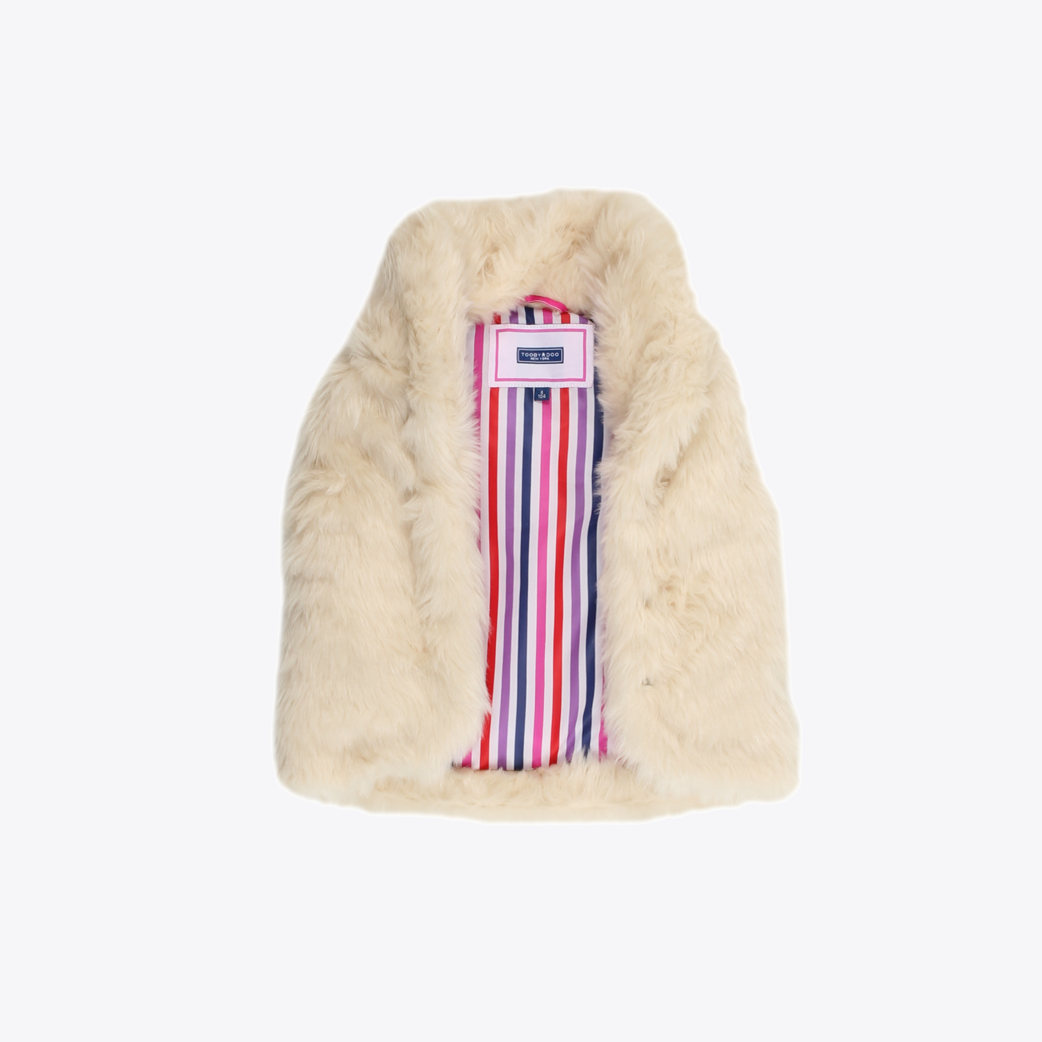 Take a walk on the wild side. This versatile faux-fur vest with its bold styling makes all your girls looks fashionable. Wear it over a dress, jeans , skirts. Natural soft white with signature Tooby stripe lining. Hidden snap button closure. Dry clean. Style # 309015-01