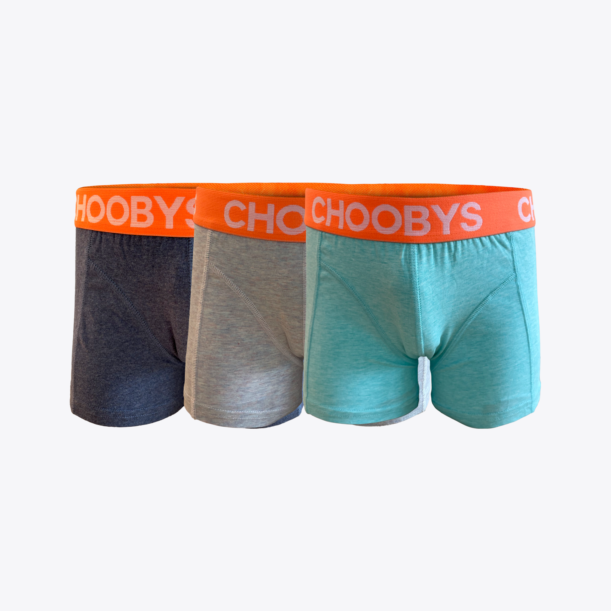 Toobydoo x CHOOBYS collaboration. Super stylish boxer brief 3-pack with heather grey melange fabrics. Created in an ultra-soft stretch cotton. Soft lined elastic waist band. CHOOBYS run slightly smaller than Toobydoo. Order one size up when in doubt. Machine wash cold, tumble dry low. Style # CB-3P-11