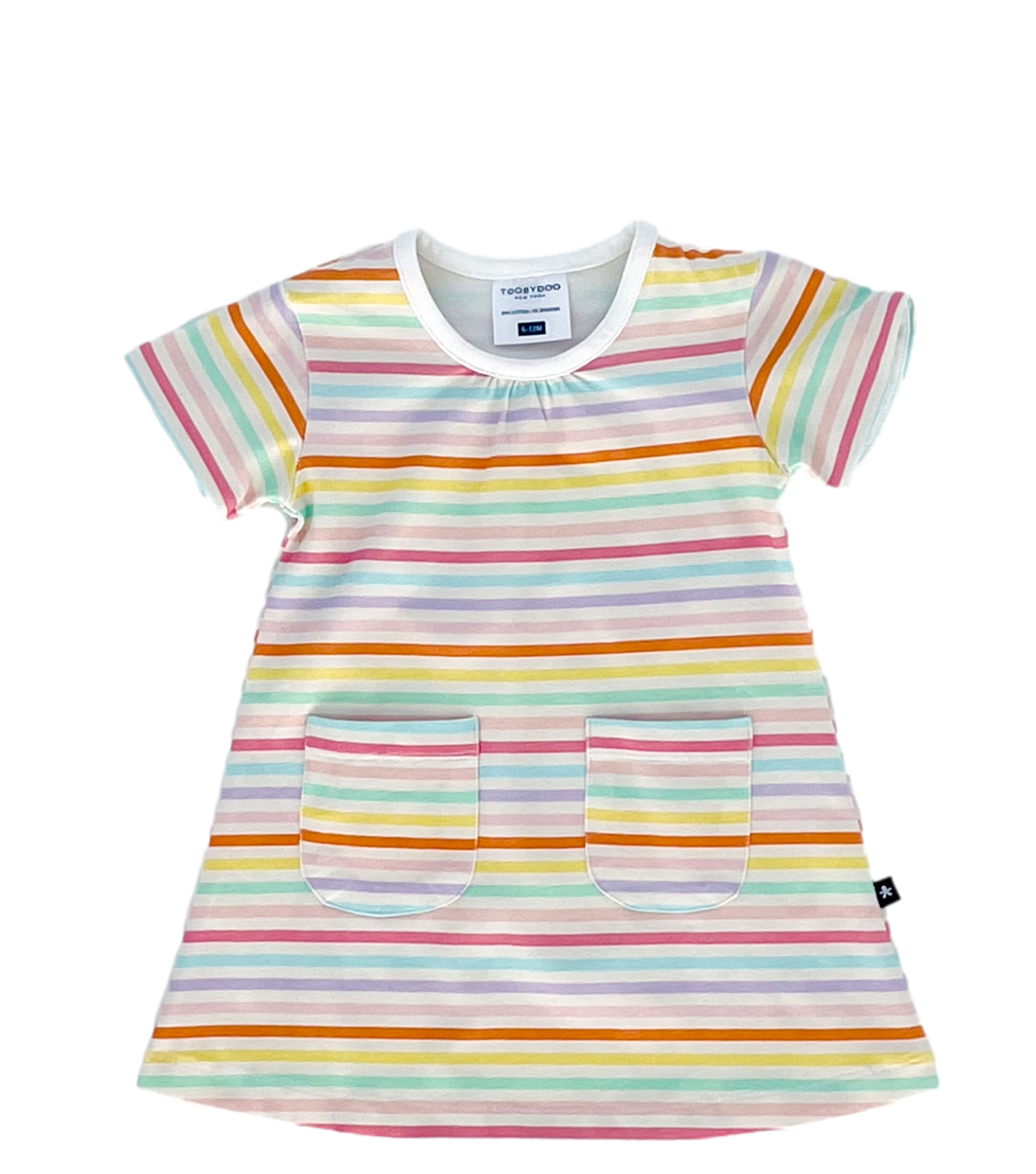 Dance over the rainbow in this rainbow stripe dress with 2 aligned front pockets. Created in an ultra-soft stretch cotton blend. Includes bloomers. Machine washable. Imported. Style # B10677