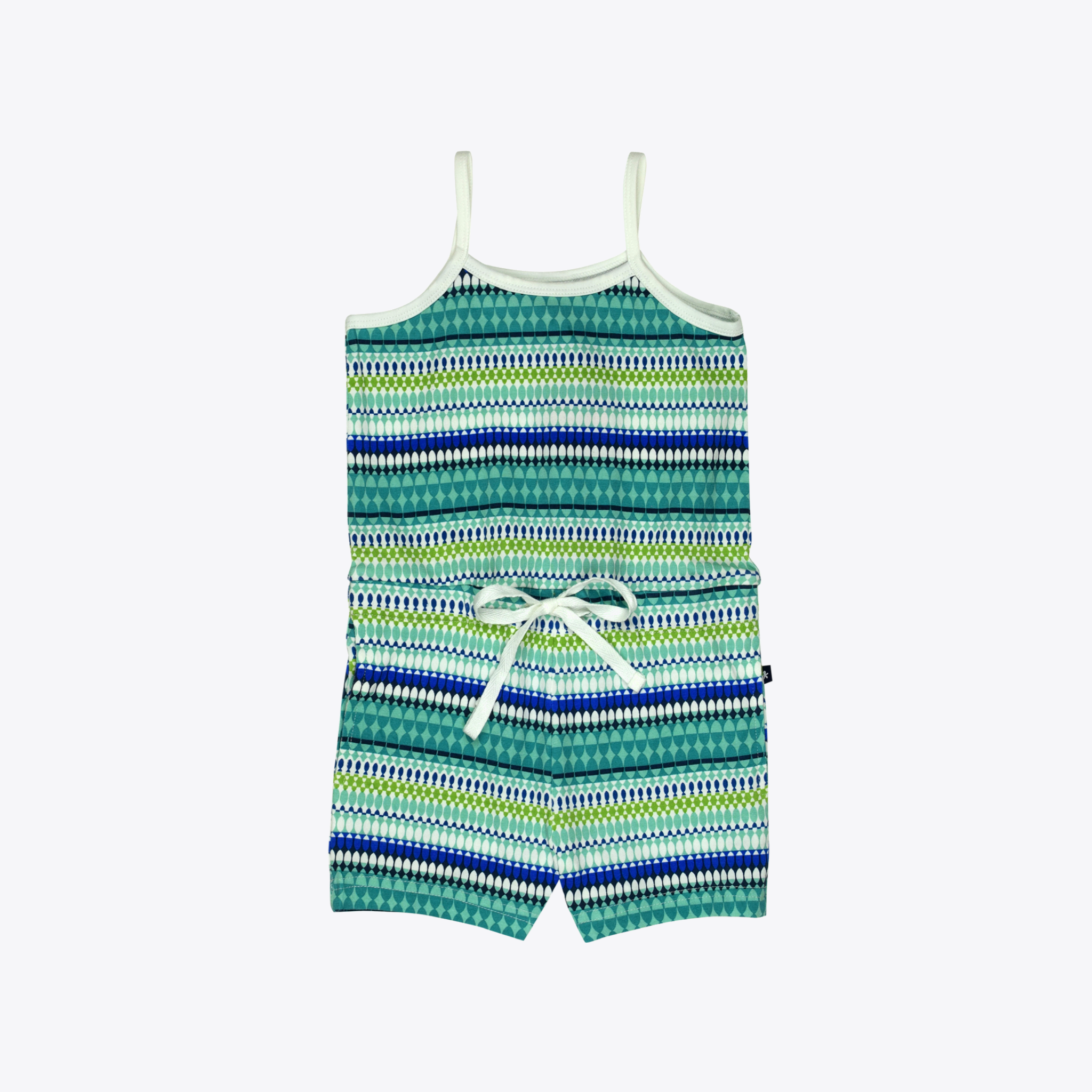 One piece romper great for park, beach or boardwalk. Yarn-dye multi colored blue and green geometric print. White draw string with side pockets. Created in a soft stretch cotton blend. Machine washable. Style # M20577