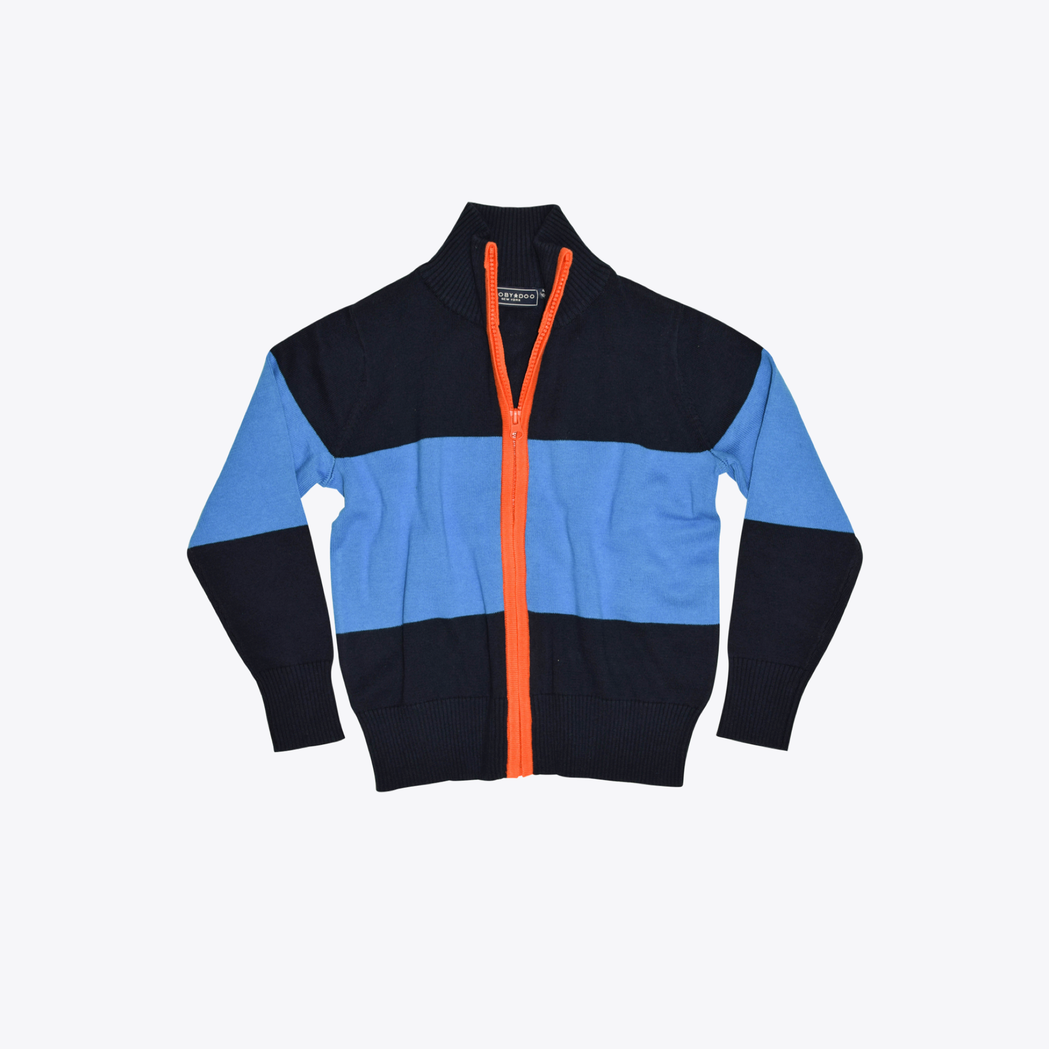 Hitting the slopes (or town) in style. Soft cotton knit navy and cobalt blue zip sweater with orange trim. Machine washable. Style # J50106