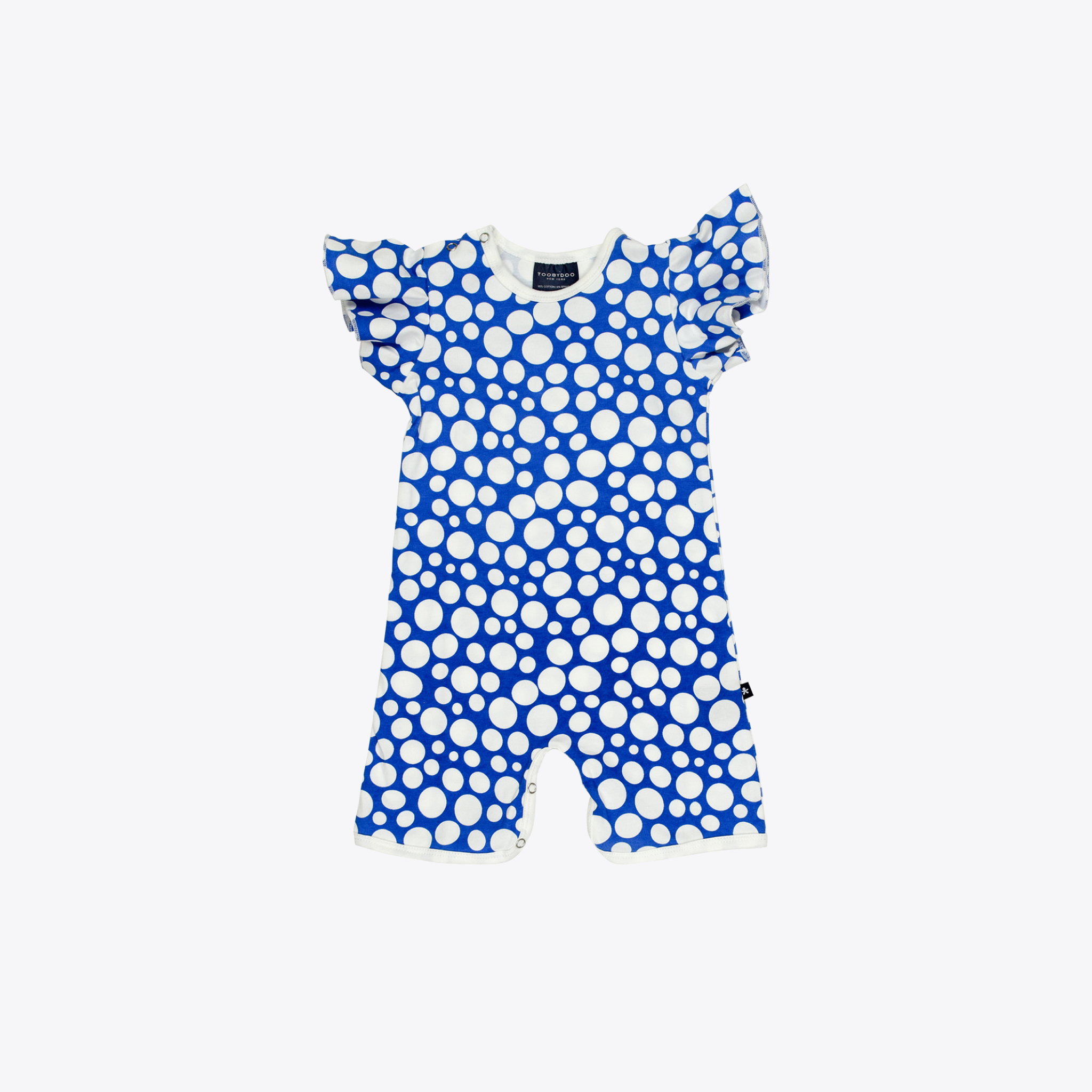 Short angel sleeve, short leg jumpsuit in a bubble polka dot print. Created in an ultra-soft stretch blend. Snap buttons on shoulder and around inside of legs for easy dressing. Machine washable. Style # B10478