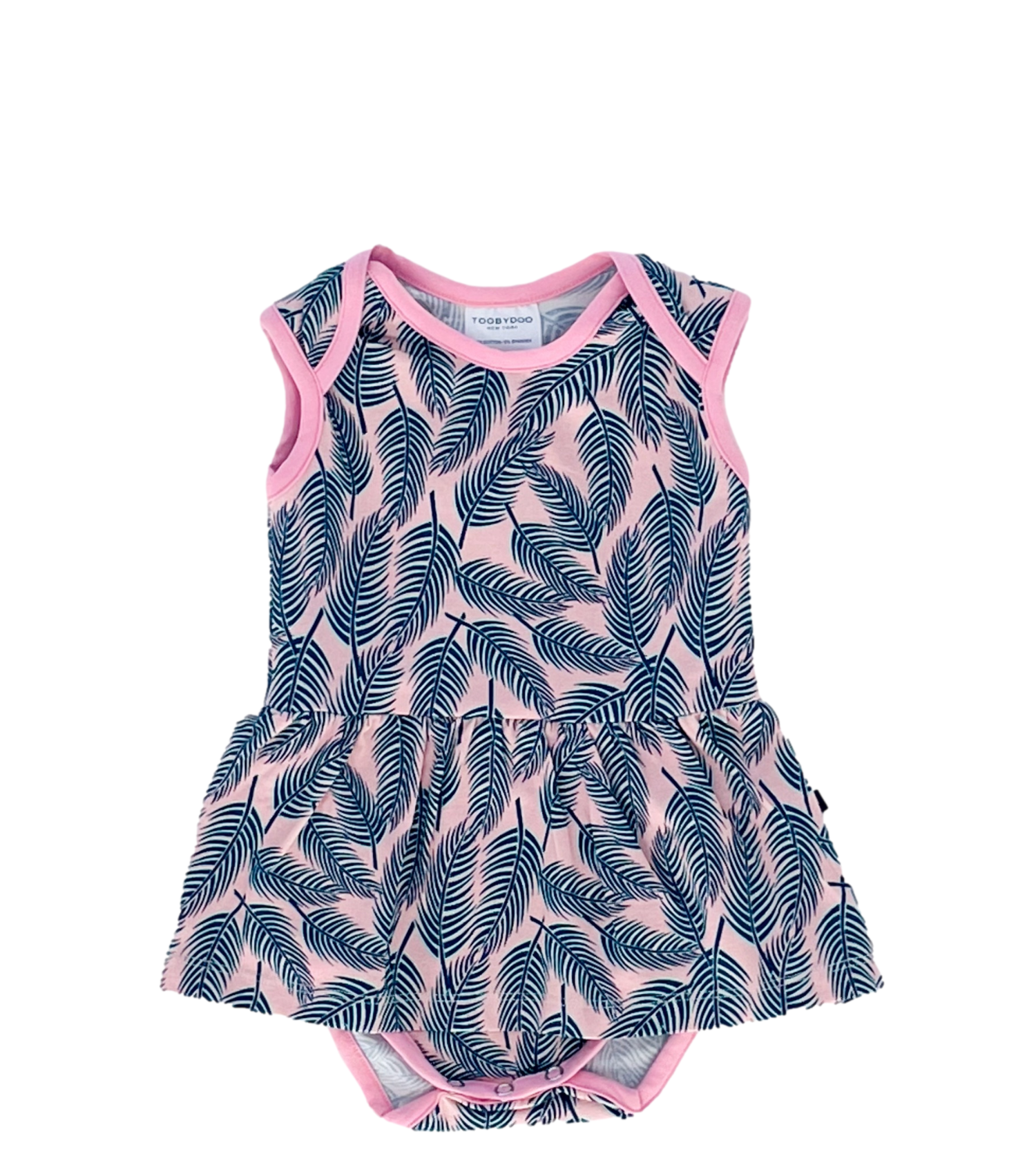 Cute baby sun dress in a tropical pink and aqua leaf pattern. Envelope style neck opening with snap buttons at legs for easy dressing. Created in a super soft luxury stretch cotton blend. Machine washable. Style # B10674