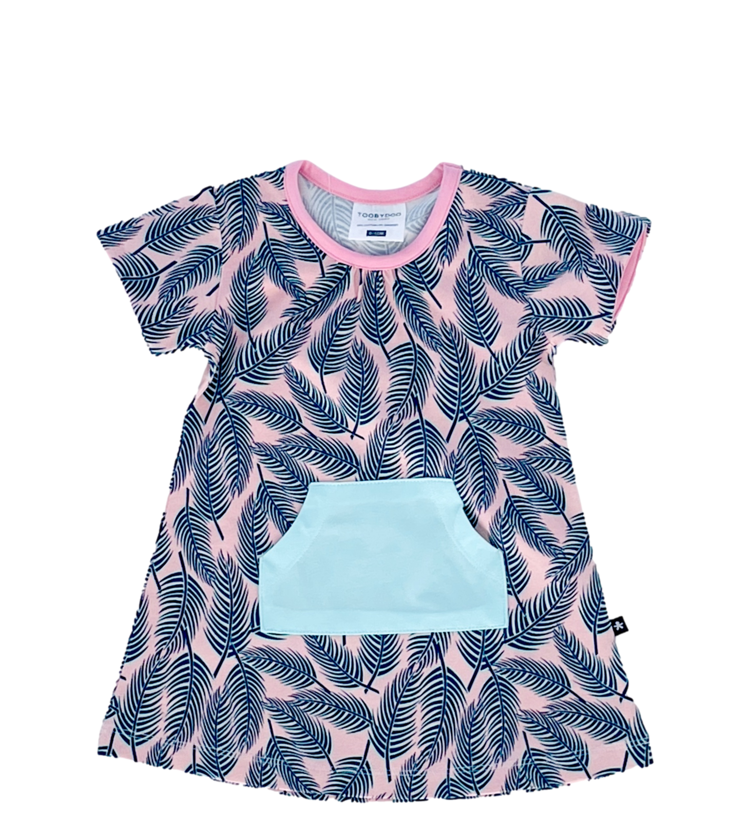 Sunny summer days dress in this tropical pink and aqua print with a fun kangaroo pocket in an aqua that matches the leaves. Created in an ultra-soft stretch cotton blend. Includes bloomers. Machine washable. Imported. Style # B10679