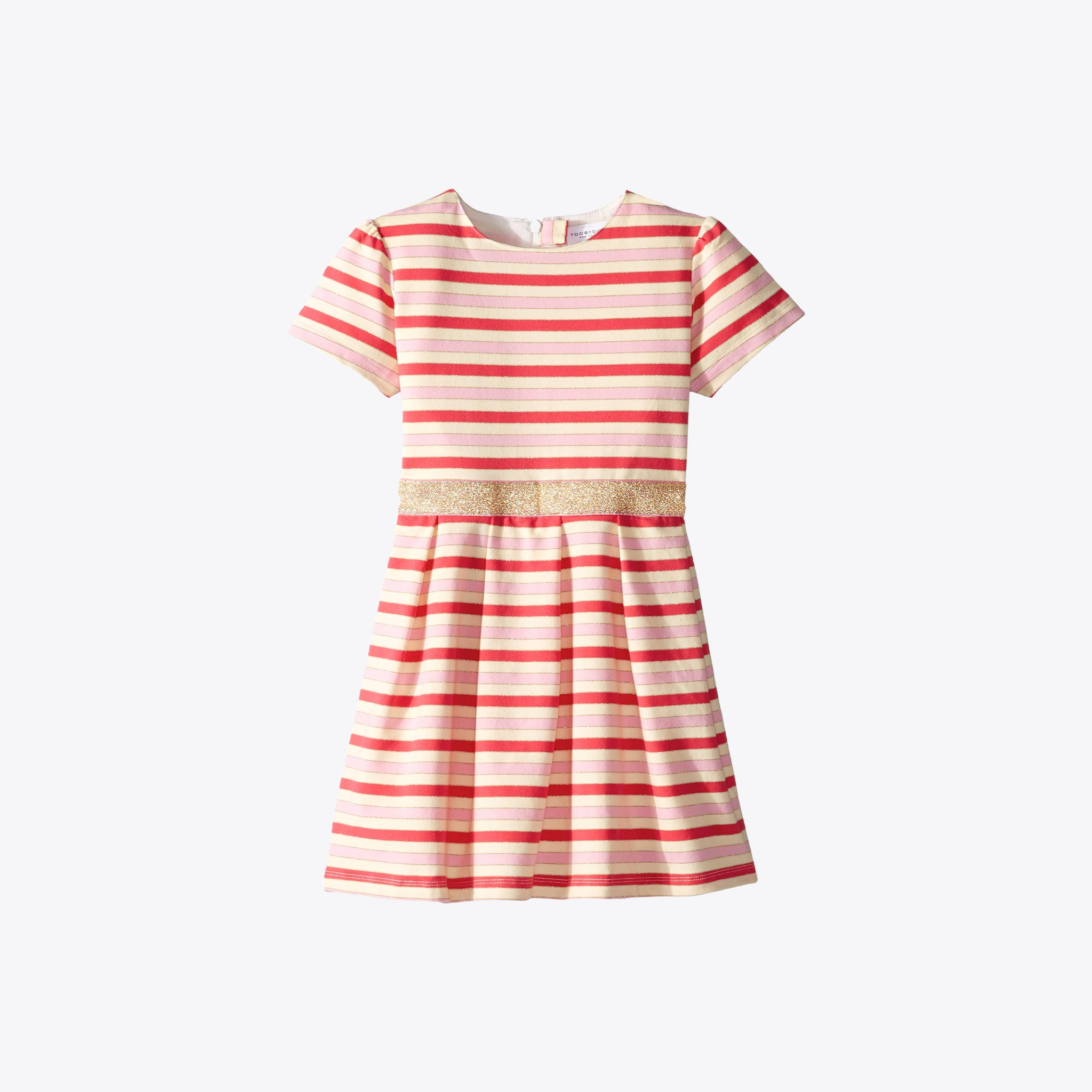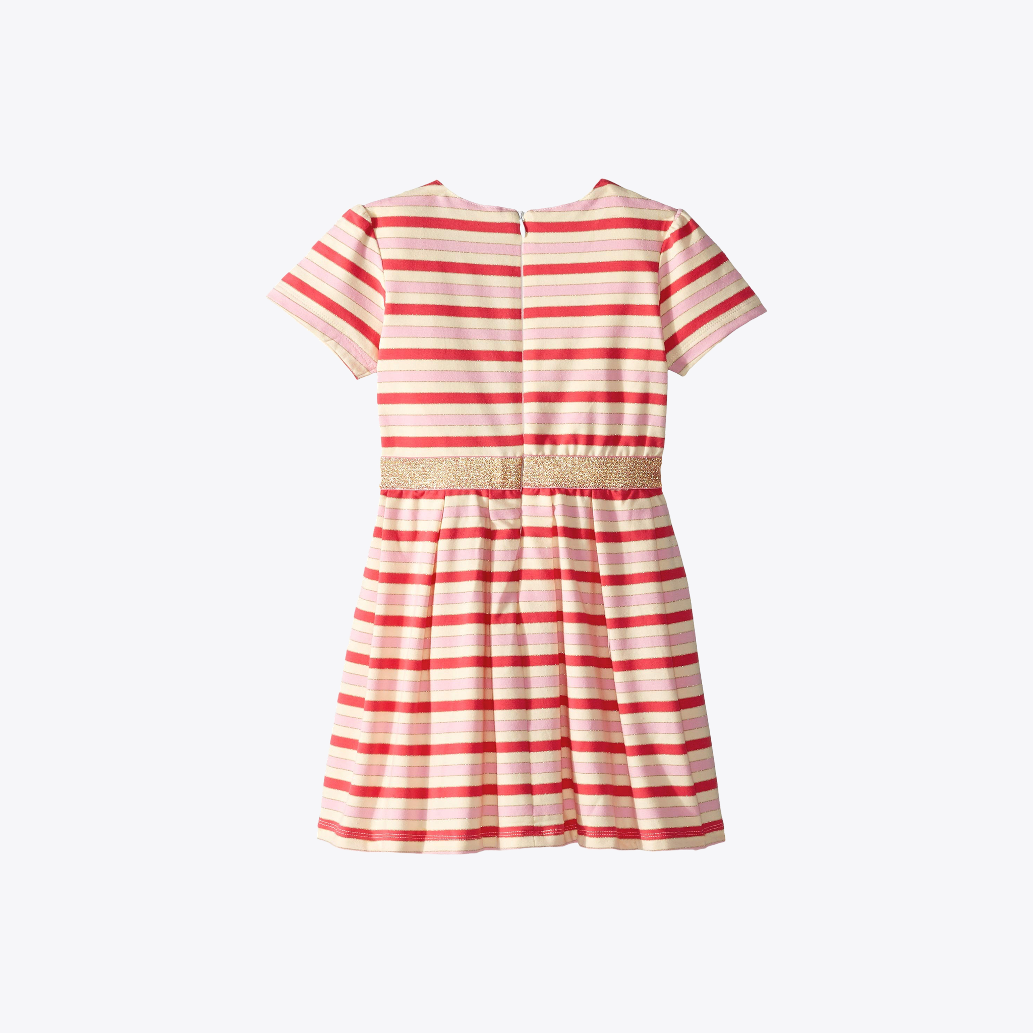 Twirl and dance with Toobydoo's fun party dress in yellow, pink and red striped jersey cotton knit. Pleated dress with round neckline. Short sleeve design. Full-zip back closure. Fully lined. Sparkly gold waist band belt. Created in a stretch cotton blend. Machine wash cold, tumble dry low. Style # M20571