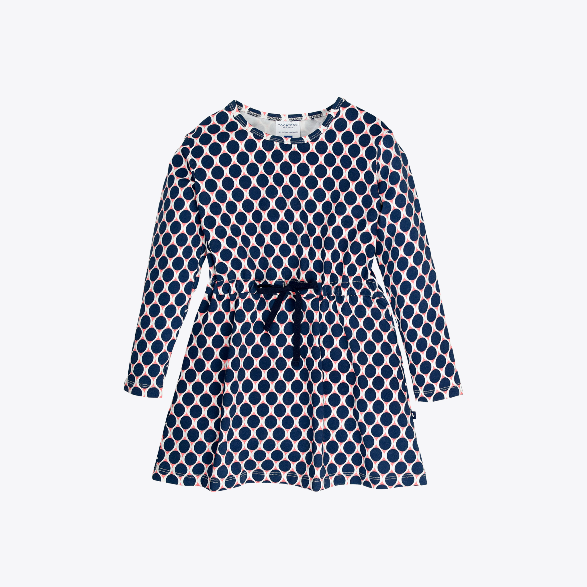 New dress with a tie waist made with a comfortable soft jersey knit fabric. Navy and orange funky geometric, modern polka dot print. Long sleeve and adjustable contrasting navy tie. Super cute! Machine washable. Style # M20629