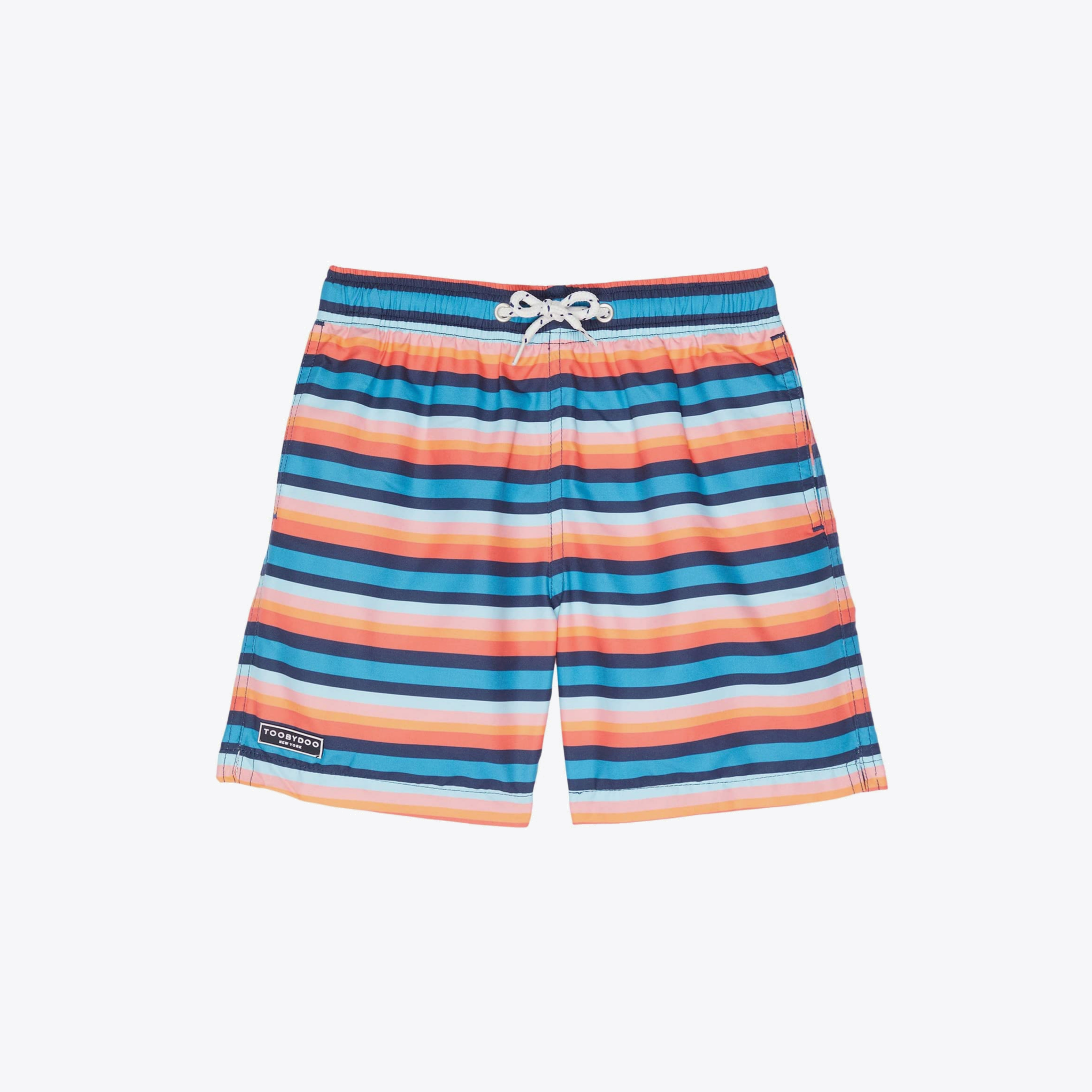 Luxury board shorts with signature Toobydoo vertical funk stripe print. Features an elastic waist band, sailor style drawstring, side pockets, full mesh lining, back pockets with velcro closure, special eyelets for rapid air evacuation. Shorts have a cotton feel and are quick drying (100% polyamide). Style # S20147