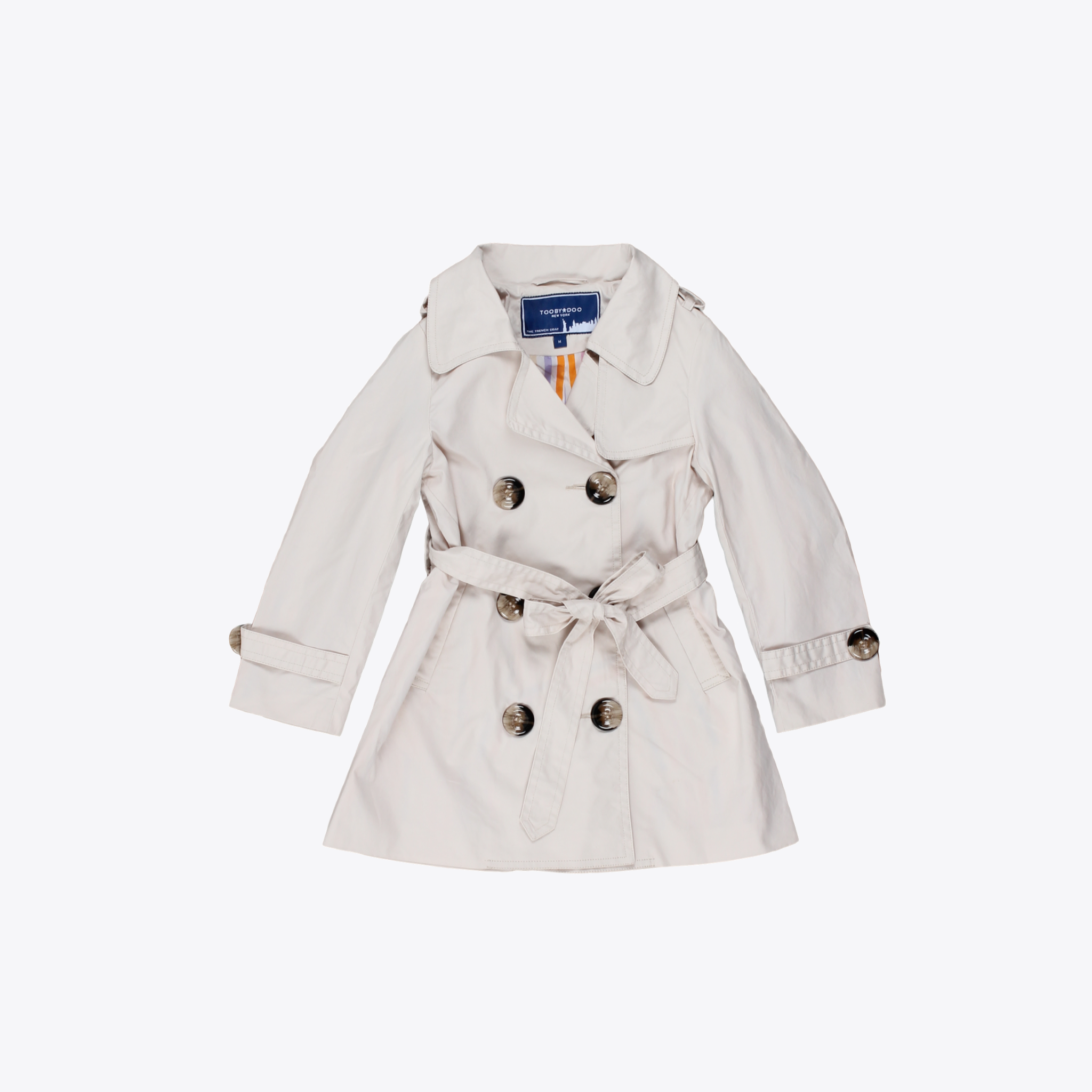 Toobydoo trench coat. Woven cotton shell fabric and signatre Toobydoo stripe polyester lining. Side pockets and belt. Hand wash cold. Style # 309035-01