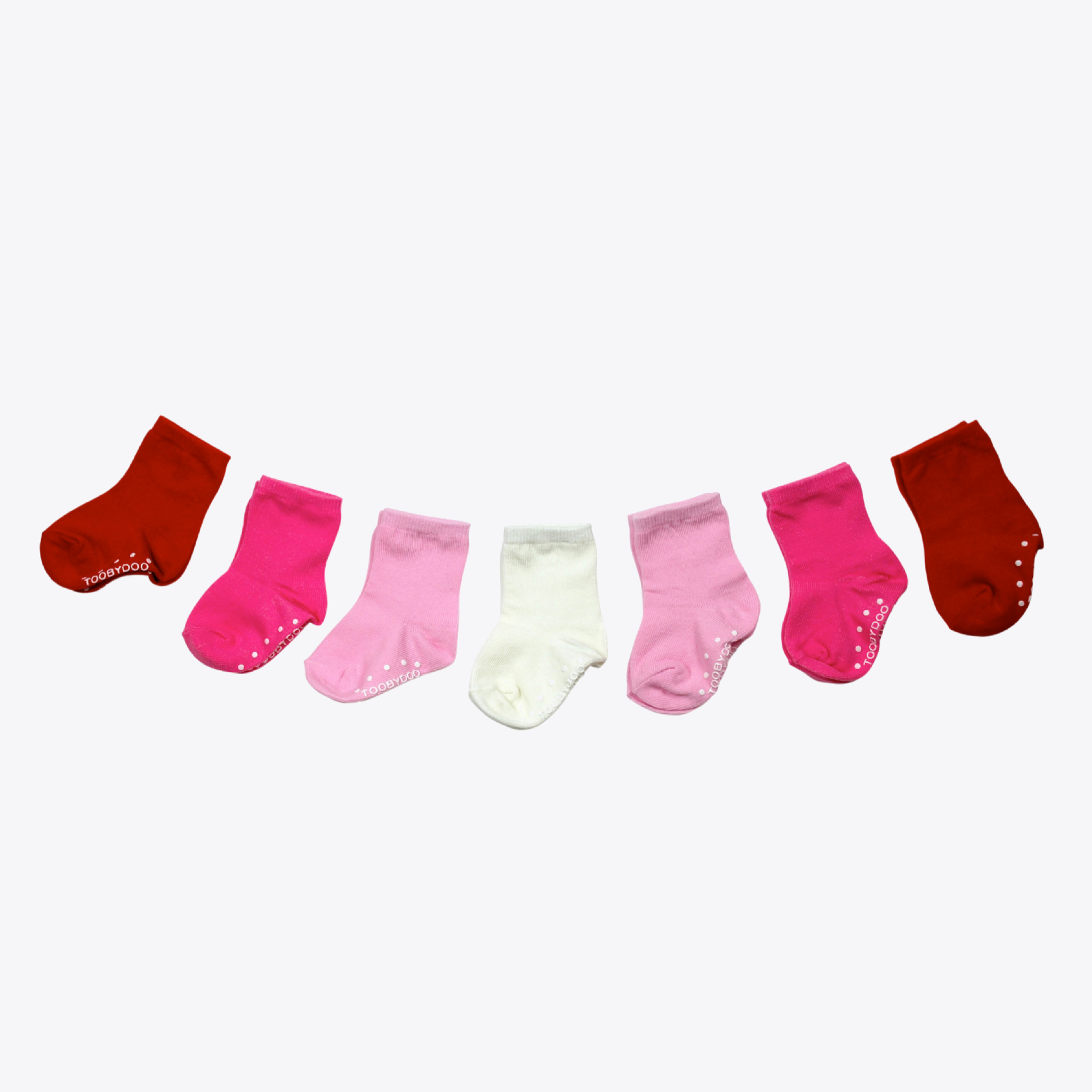 Yum! A weeks supply of socks in a box. Perfectly selected set of 7 solid colors to match Toobydoo jumpsuits and other items. Rubber anti-slip logo on sole. The perfect gift for the design loving parent. Machine washable. Style # A10002