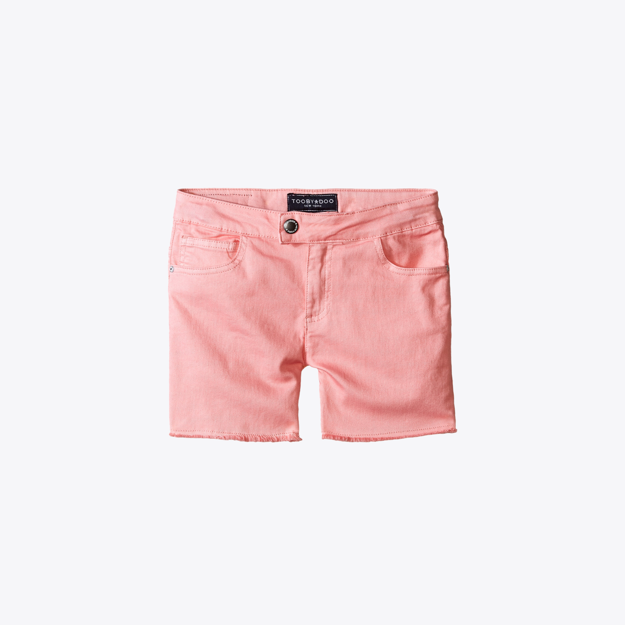 Premium denim jeans shorts created in cotton with a hint of stretch in coral pink. Adjustable waist band and snap button closure. Front and back pockets. Machine washable. Style # M40055