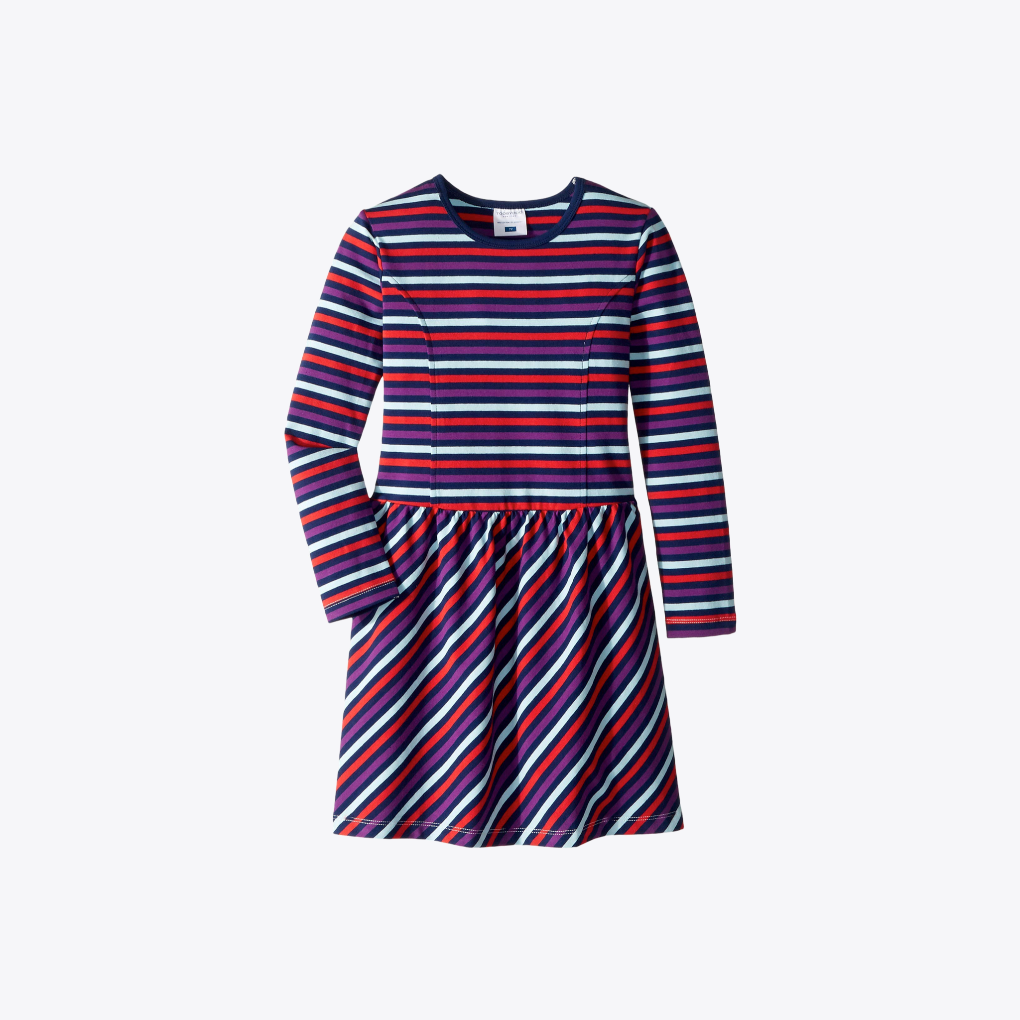 Super versatile, easy to wear long sleeve skater dress. The perfect dress for the girl on the go, created in a comfortable soft jersey knit fabric. Super fun stripe pattern with purple, red, light blue and navy! Machine washable. Style # M20508