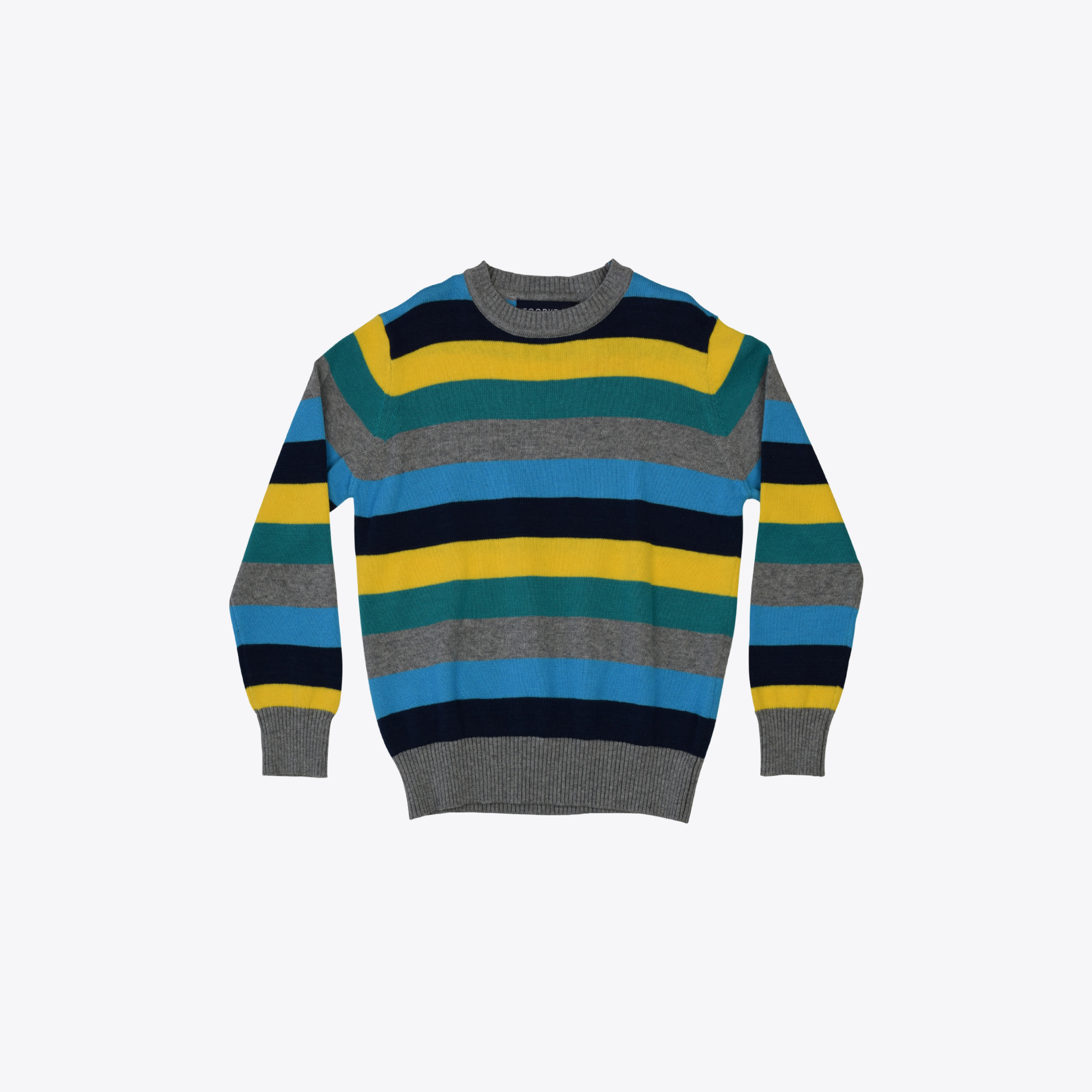 These multi-colored stripes are so classy and fun. Navy, yellow, green, heather grey and medium blue complete this fun stripped sweater with heather grey collar, cuffs and waist band. Who wouldn't want to wear this sweater! Created in an ultra-soft cotton. Machine wash cold, lay flat to dry. Style #J50138