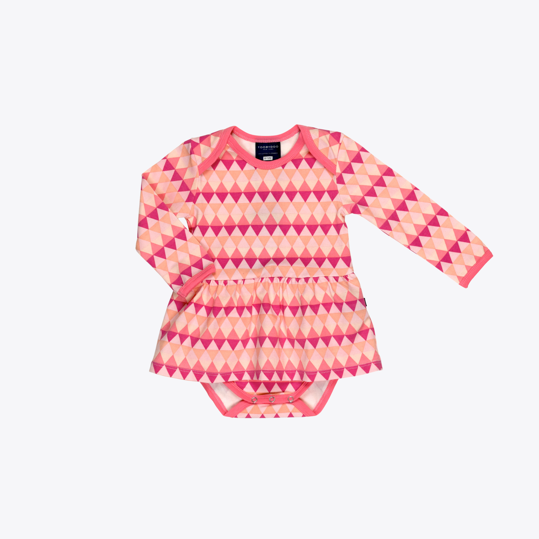 Cute baby bodysuit dress. Envelope style neck opening with snap buttons at legs for easy dressing. Created in a super soft stretch cotton blend. Machine washable. Style # B10415