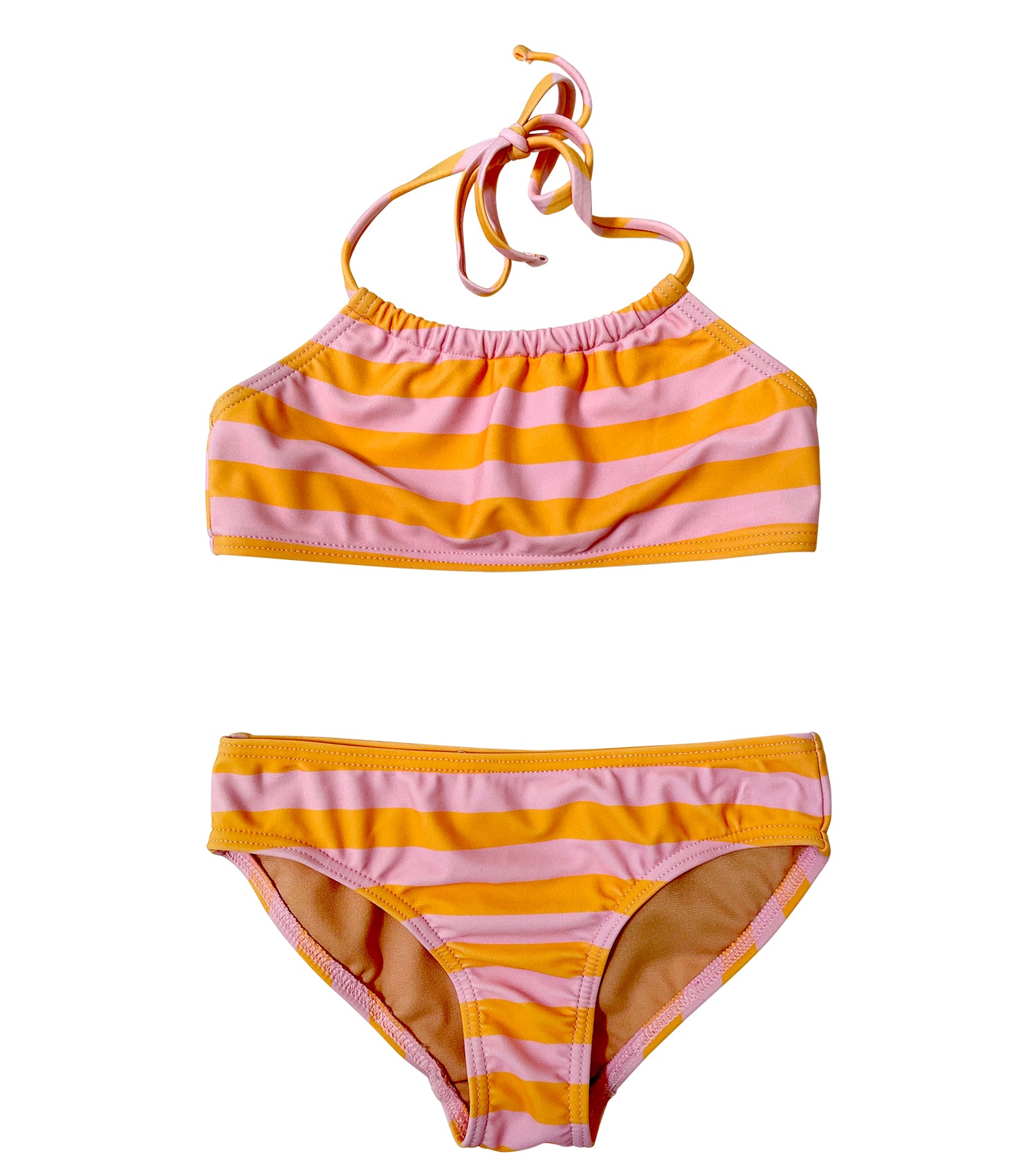 That tropical, beachy feeling! Bandeau top bikini with a halter tie around the neck and a hook-and-eye closure around the back. Light pink and ochre yellow stripe pattern. Full coverage bottom with a comfortable elastic waistband and a Toobydoo rubber printed logo at the back. Both pieces are fully lined. Shell created in 80% nylon and 20% spandex, lining in 92% polyester, 8% spandex. Machine wash cold. Style# S40131
