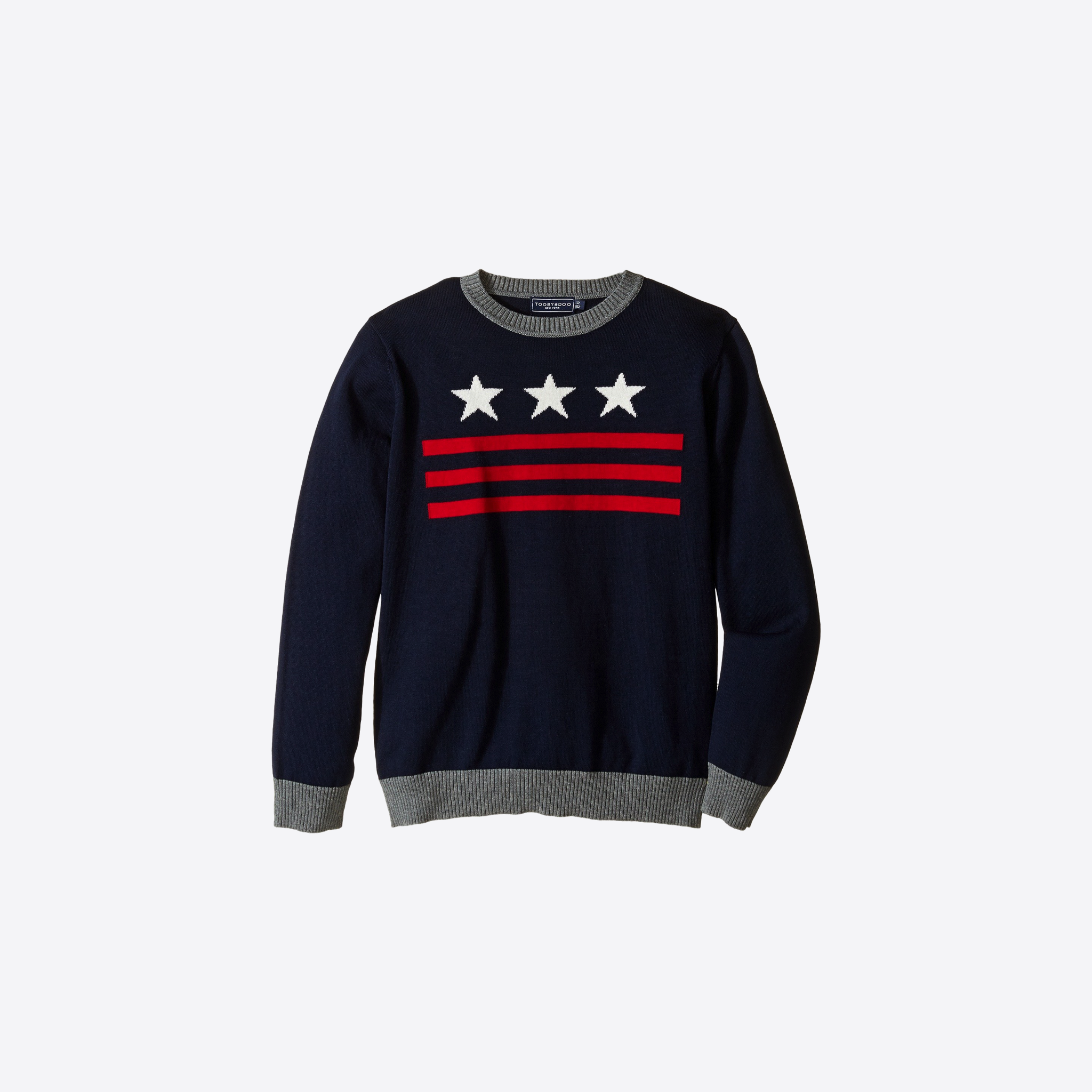 Loving some stars and stripes... Soft cotton knit navy crew neck sweater with white stars and red stripes knit and heather grey trim ribbed collar and cuffs. Machine washable. Style # J50113