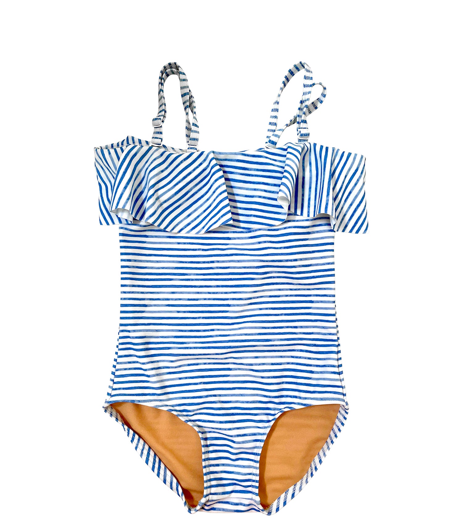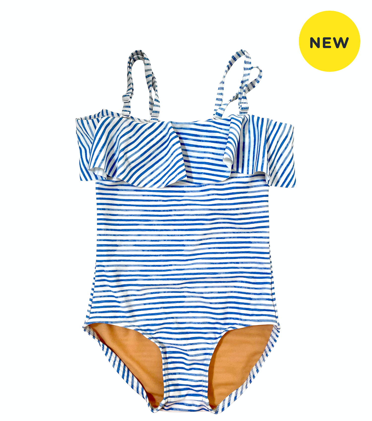 Be 'tres chic' in this blue watercolor stripe ruffle top, one-piece swimsuit with a halter tie around the neck. Full rear coverage. Fully lined. Shell created in 80% nylon and 20% spandex, lining in 92% polyester, 8% spandex. Machine wash cold. Style# S30122