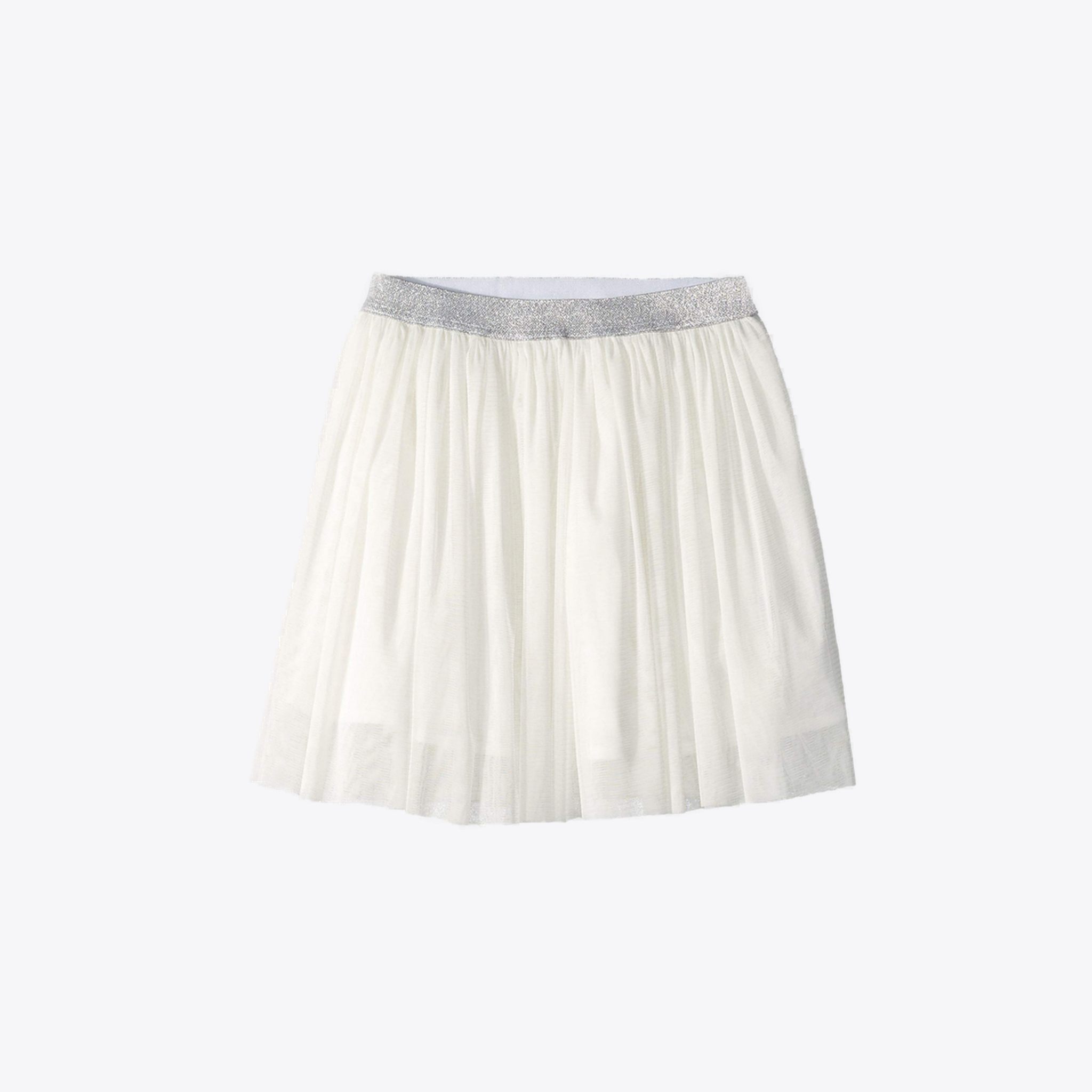 Fantastic white twirl tulle skirt with cotton lining. Silver sparkle elastic waist band. Machine washable. Style # M40090