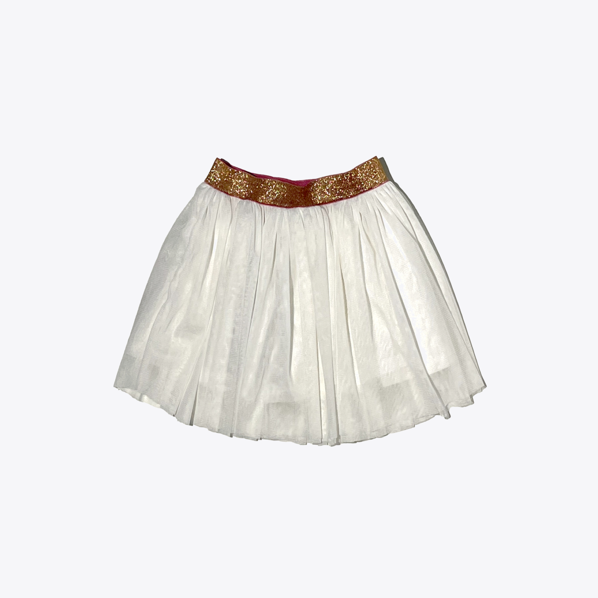 Fantastic white twirl tulle skirt with cotton lining. Matches everything! Gold sparkle elastic waist band. Machine washable. Style # M40099
