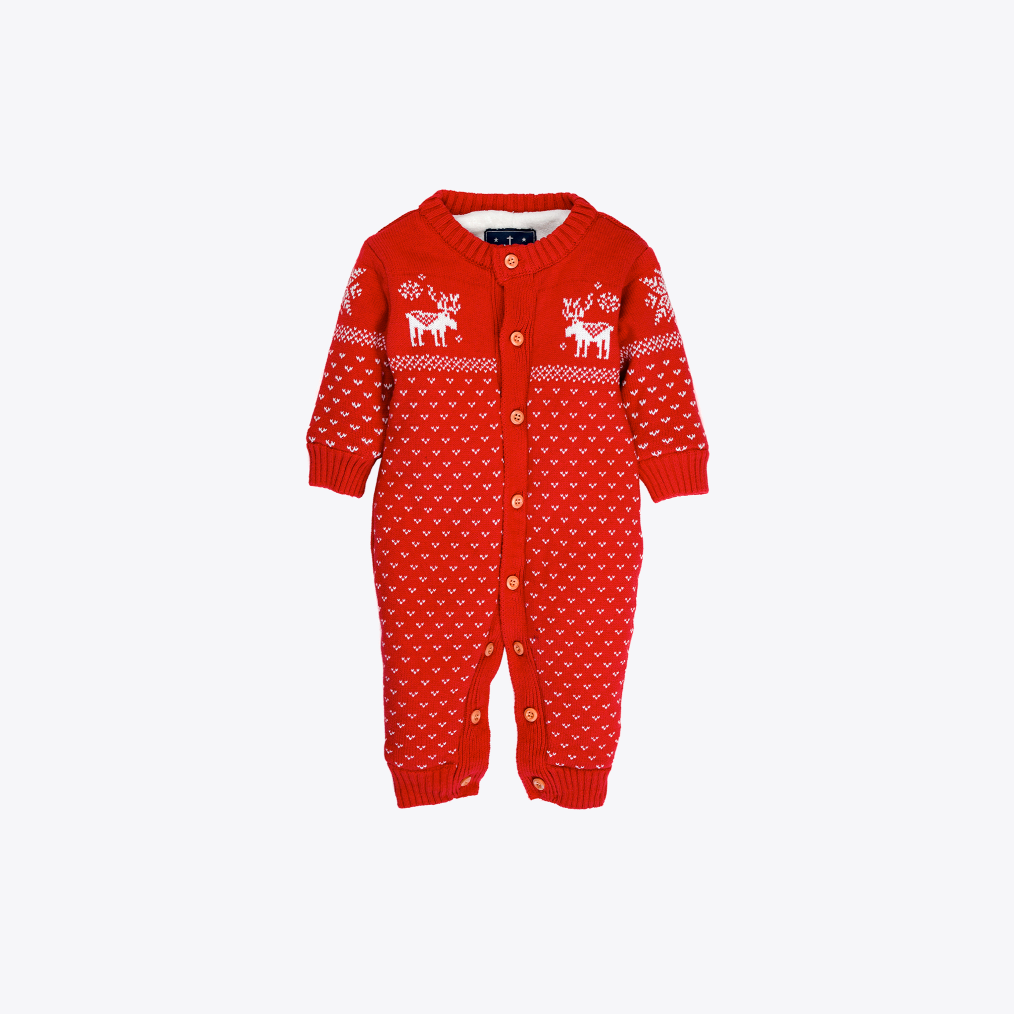 Baby will stay warm and cozy in this new sweater knit, fleece lined onesie with hoodie. Red with white moose and designs. Matching solid red ribbed cuffs at wrists and ankles. Buttons down the body and leg for each dressing. Created in an ultra-soft cotton sweater knit for a comfortable fit. Shell-100% cotton. Lining-100% polyester. Machine washable. Style # UB90056